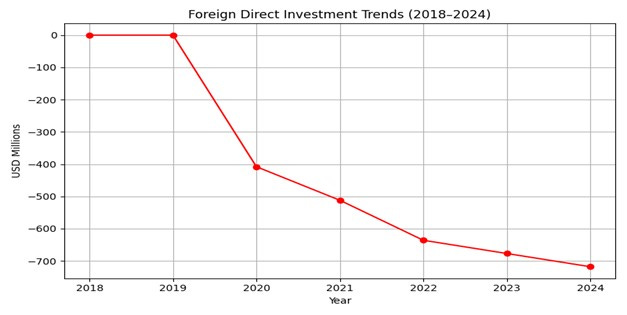 Foreign Direct Investment (FDI) has been consistently negative since 2020, with $718 million in net outflows in 2024. This signals capital flight, profit repatriation, and investor uncertainty - often linked to institutional ambiguity, unclear revenue assignments (e.g., ports, telecoms), and regulatory fragmentation. While capital account inflows rose from 11% to 16% of GDP, driven by grants and debt relief, the lack of complementary FDI or export growth means these inflows risk being consumed rather than invested.