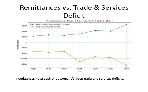 Remittances have been the backbone of Somalia’s external stability. Secondary income, largely from the diaspora, averaged over $4 billion annually, peaking at $6.5 billion in 2024, equivalent to 56% of GDP. These inflows act as quasi-fiscal transfers, financing household consumption, education, and health in the absence of a formal fiscal redistribution mechanism.