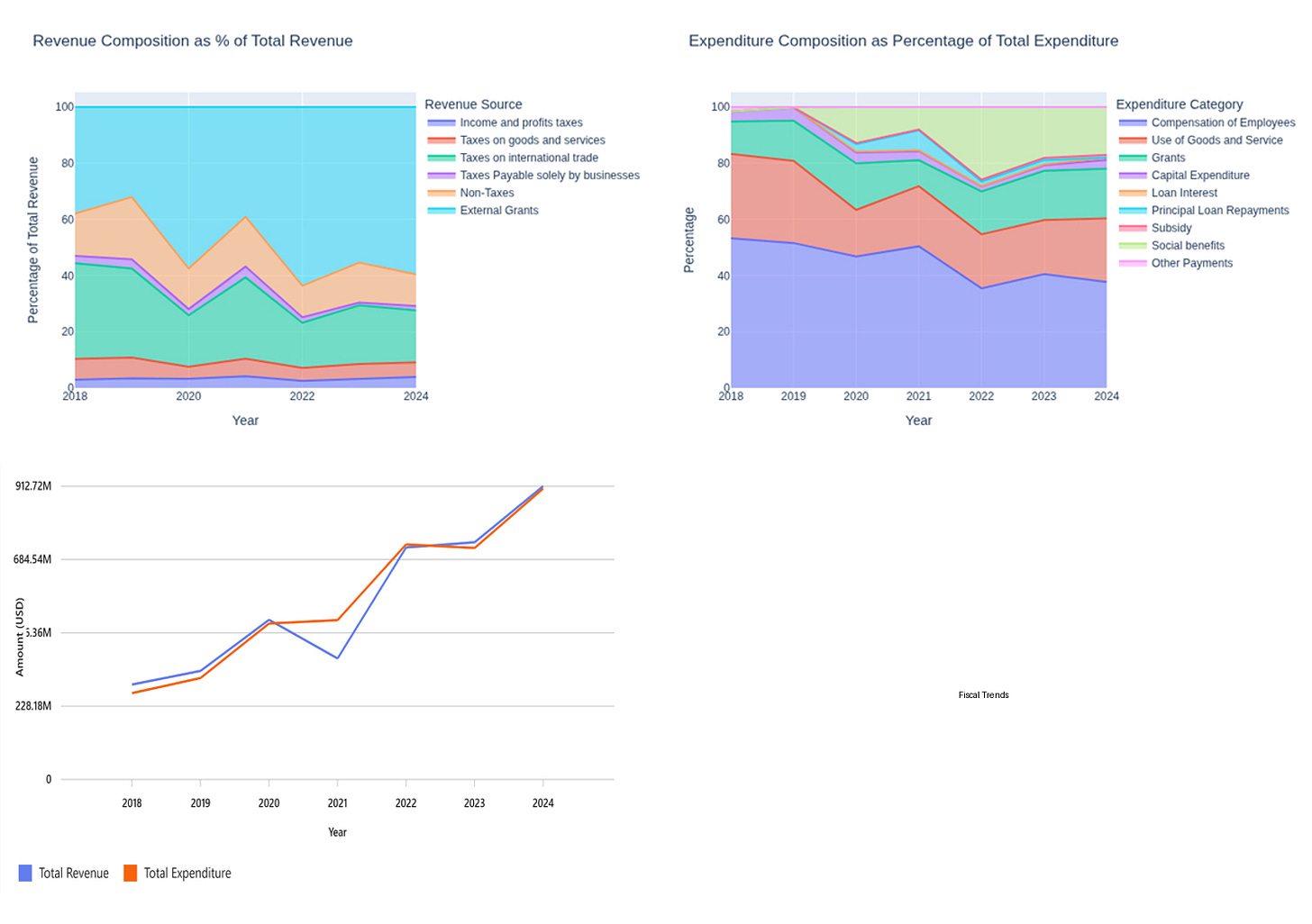 Let’s start with the big picture. As you can see in the top-left corner of the figure above, Somalia has been leaning heavily on external grants - in some years, they’ve made up 50–60% of total revenue. That’s mostly because the country’s domestic revenue base is still very weak. Most of the taxes come from international trade, while income and business taxes barely register. This tells us a few things: the tax base is narrow, enforcement is weak, and a huge chunk of the economy operates informally.
